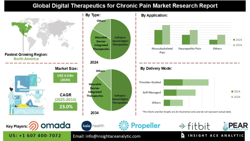 InsightAce Analytic Pvt. Ltd. announces the release of a market assessment report on the “Global Digital Therapeutics for Chronic Pain Market Size, Share & Trends Analysis Report By Type (Software-Based Digital Therapeutics, Mobile Application Therapeutics, and Wearable Device-Integrated Therapeutics), Delivery Mode (Self-Managed and Provider-Guided), Application (Neuropathic Pain, Musculoskeletal Pain, Fibromyalgia, and Post-Surgical Pain), End-use (Patients and Healthcare Providers),-Market Outlook And Industry Analysis 2034″