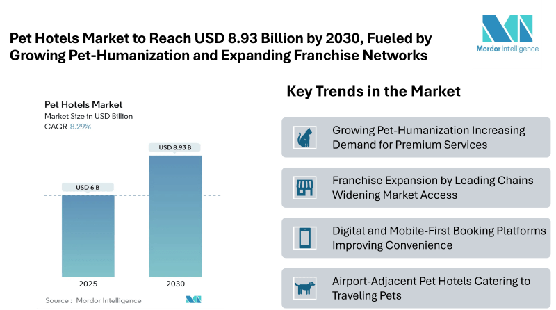 According to Mordor Intelligence, the pet hotels market size currently generates USD 6.00 billion in 2025 revenue and is forecast to reach USD 8.93 billion by 2030, advancing at an 8.29% CAGR. North America leads in market spending, while Asia-Pacific is emerging as the fastest-growing region due to urbanization, smaller household sizes, and increasing affluence.
