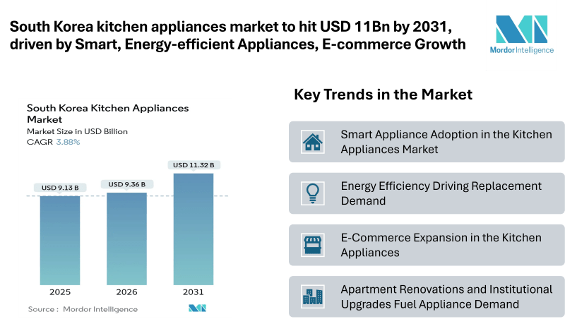 According to Mordor Intelligence, the South Korea kitchen appliances market size is witnessing steady expansion as households and institutions continue to upgrade appliances with connected features and higher energy-efficiency standards. According to industry analysis, the market is expected to increase from USD 9.13 billion in 2025 to USD 9.36 billion in 2026 and reach USD 11.32 billion by 2031, reflecting a CAGR of 3.88%.